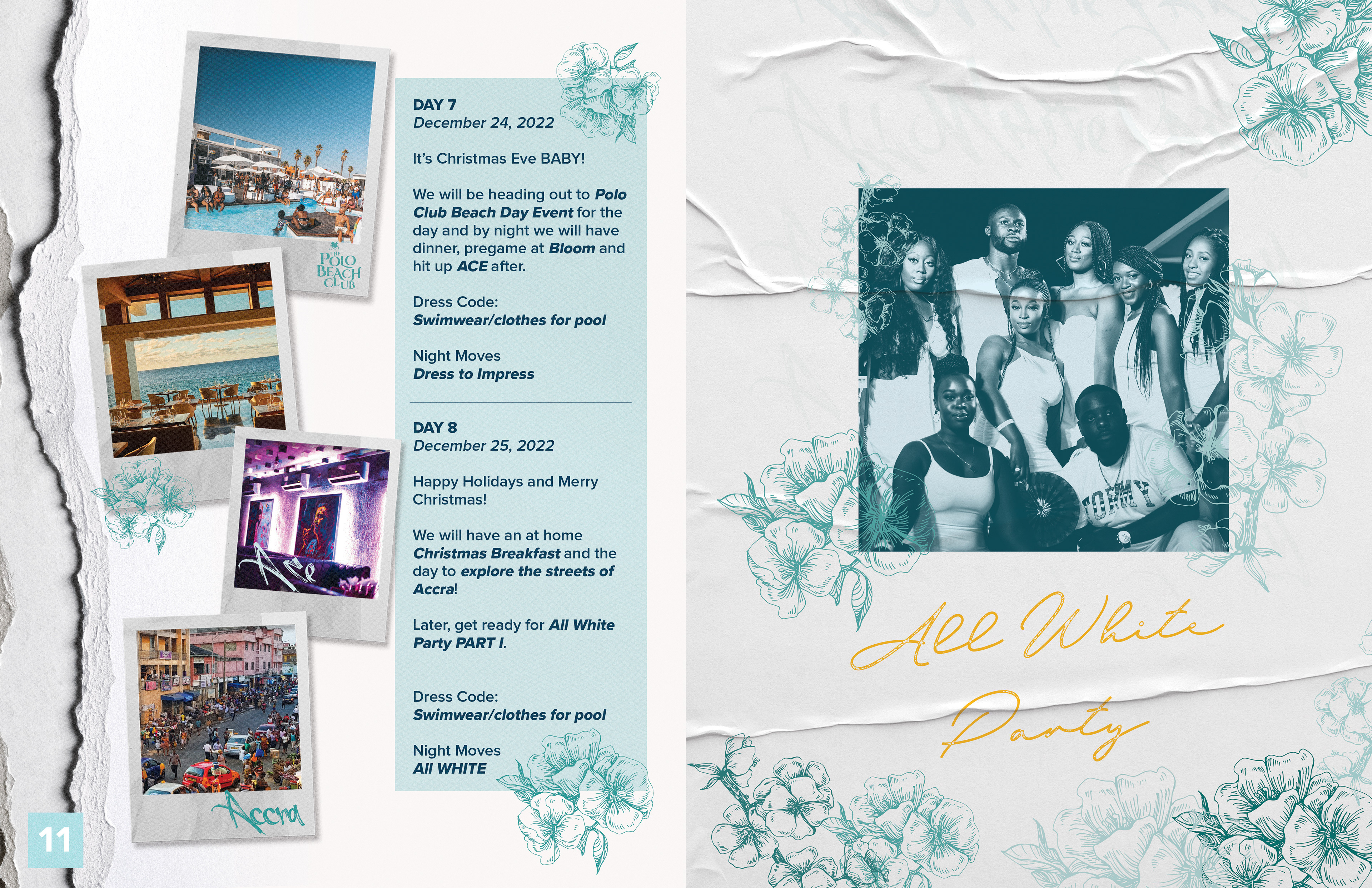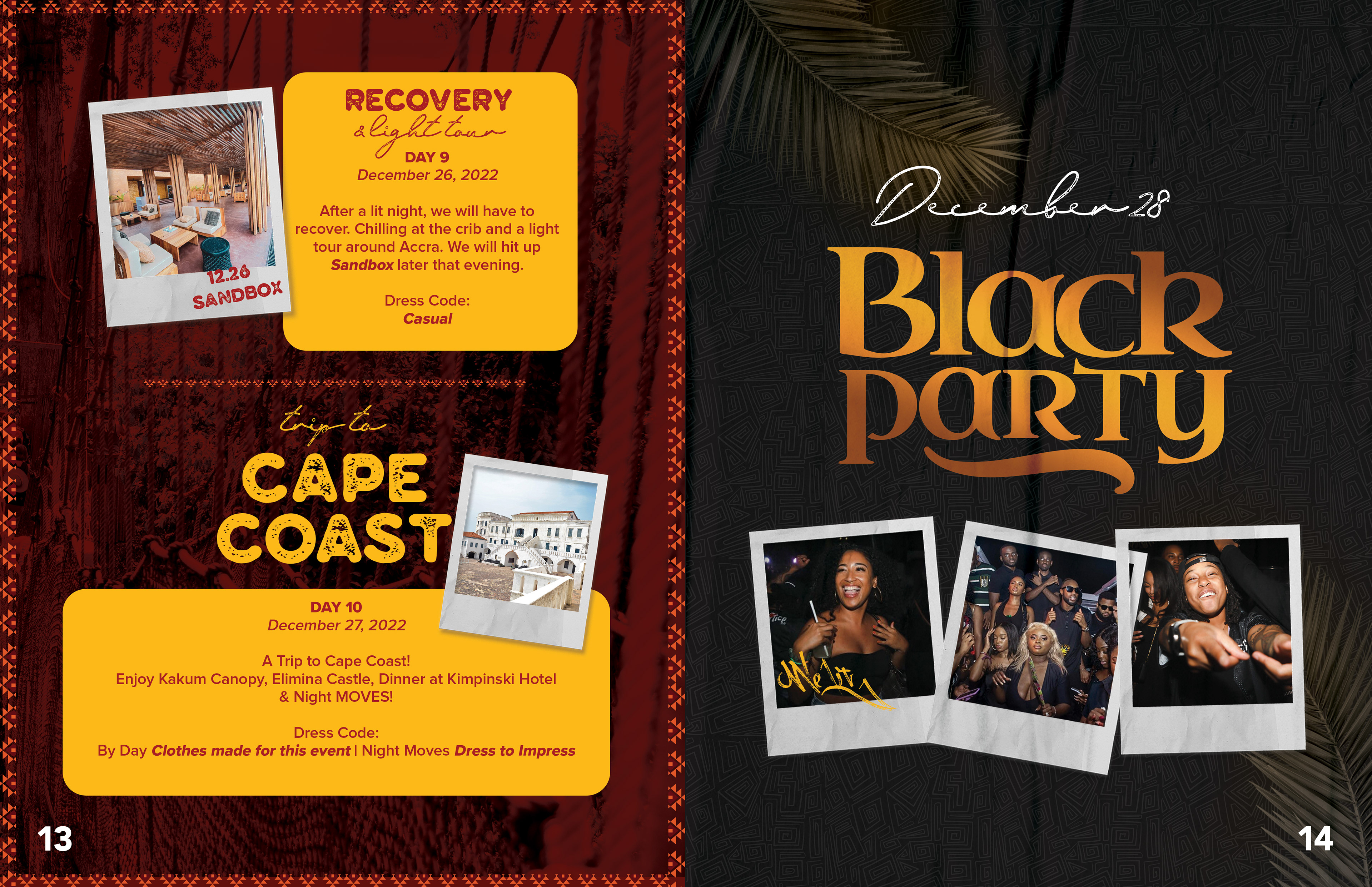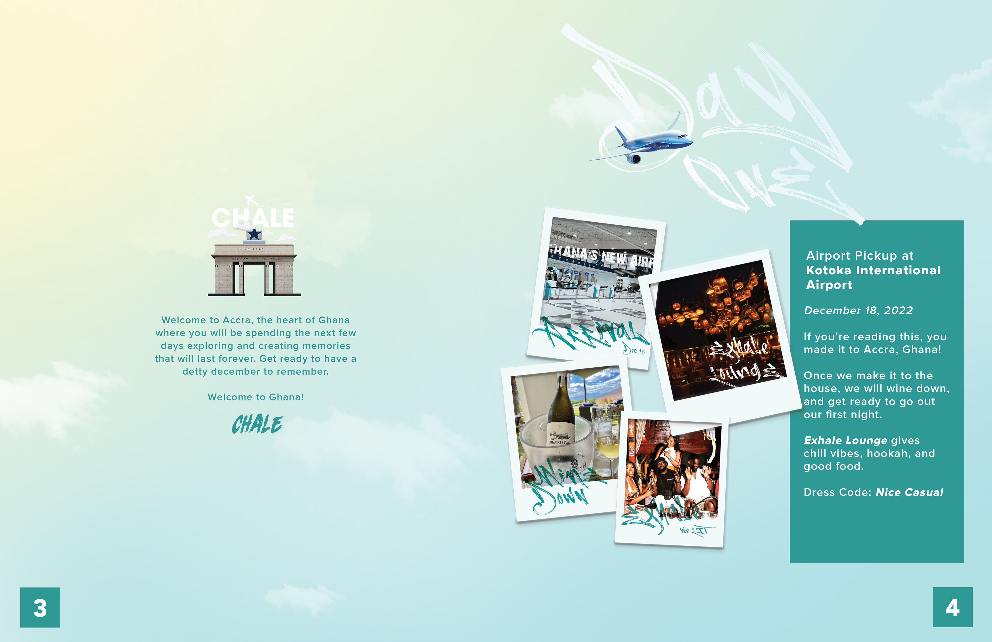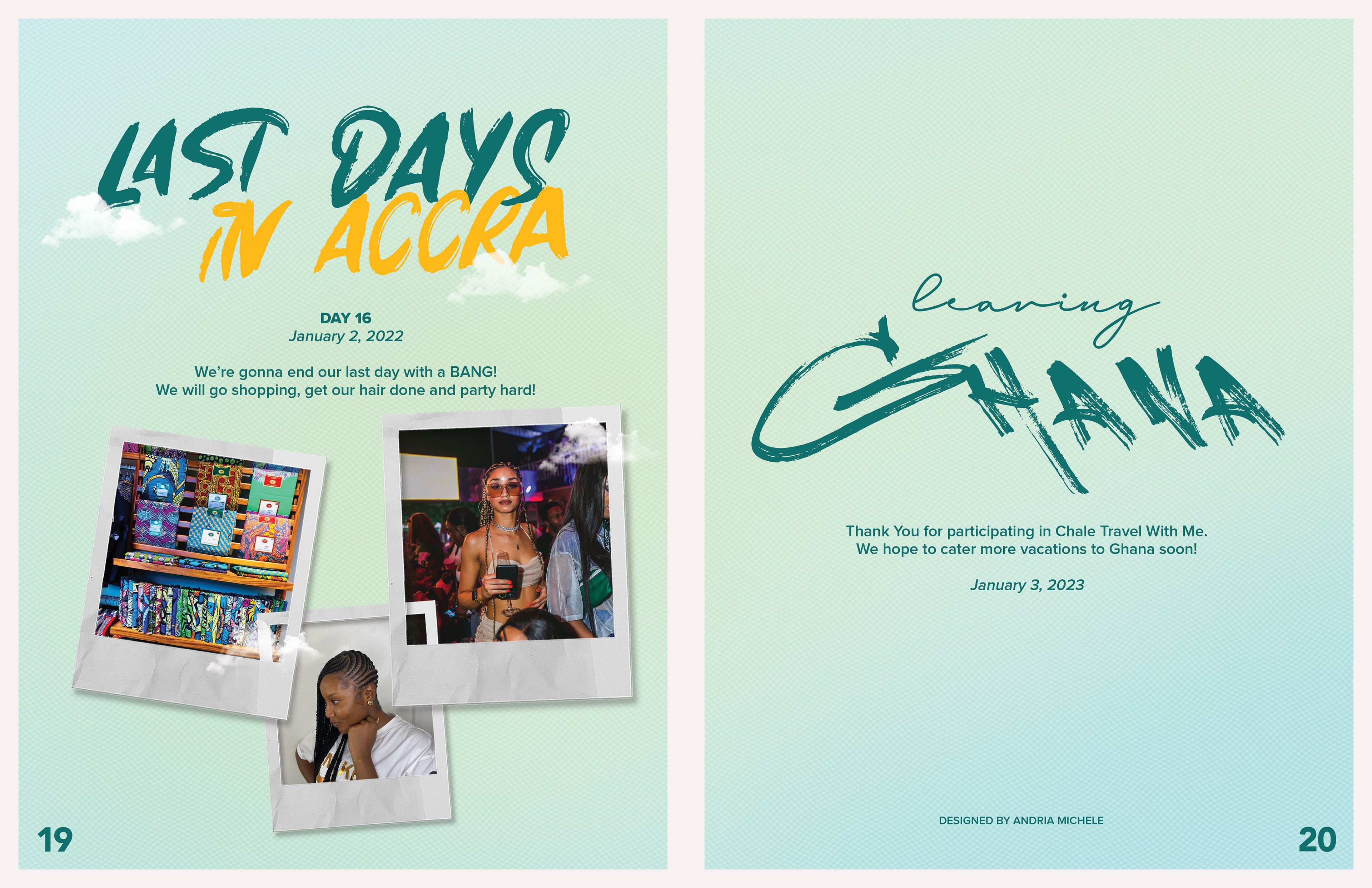Chale Travel With Me is a new travel agency that travels to Ghana every December. The creative direction was inspired by creating a magazine layout for the itinerary showcasing the different events each day.