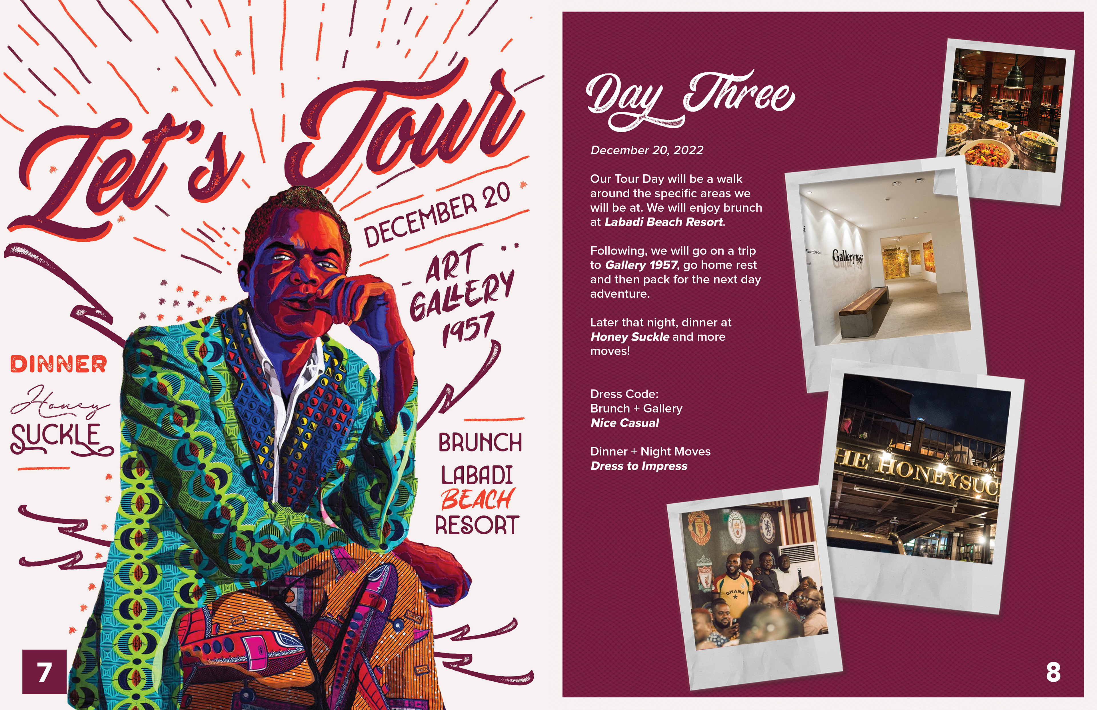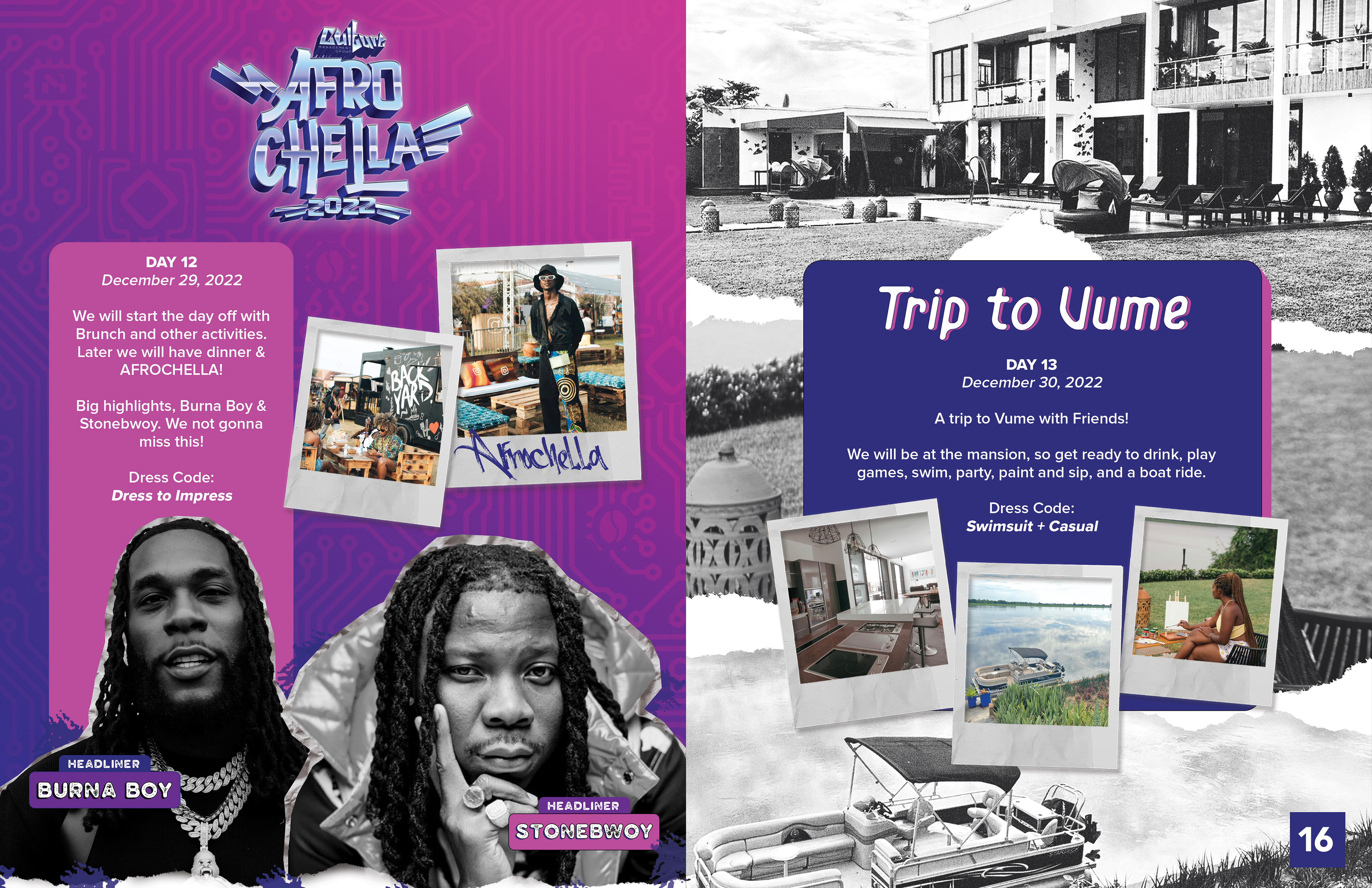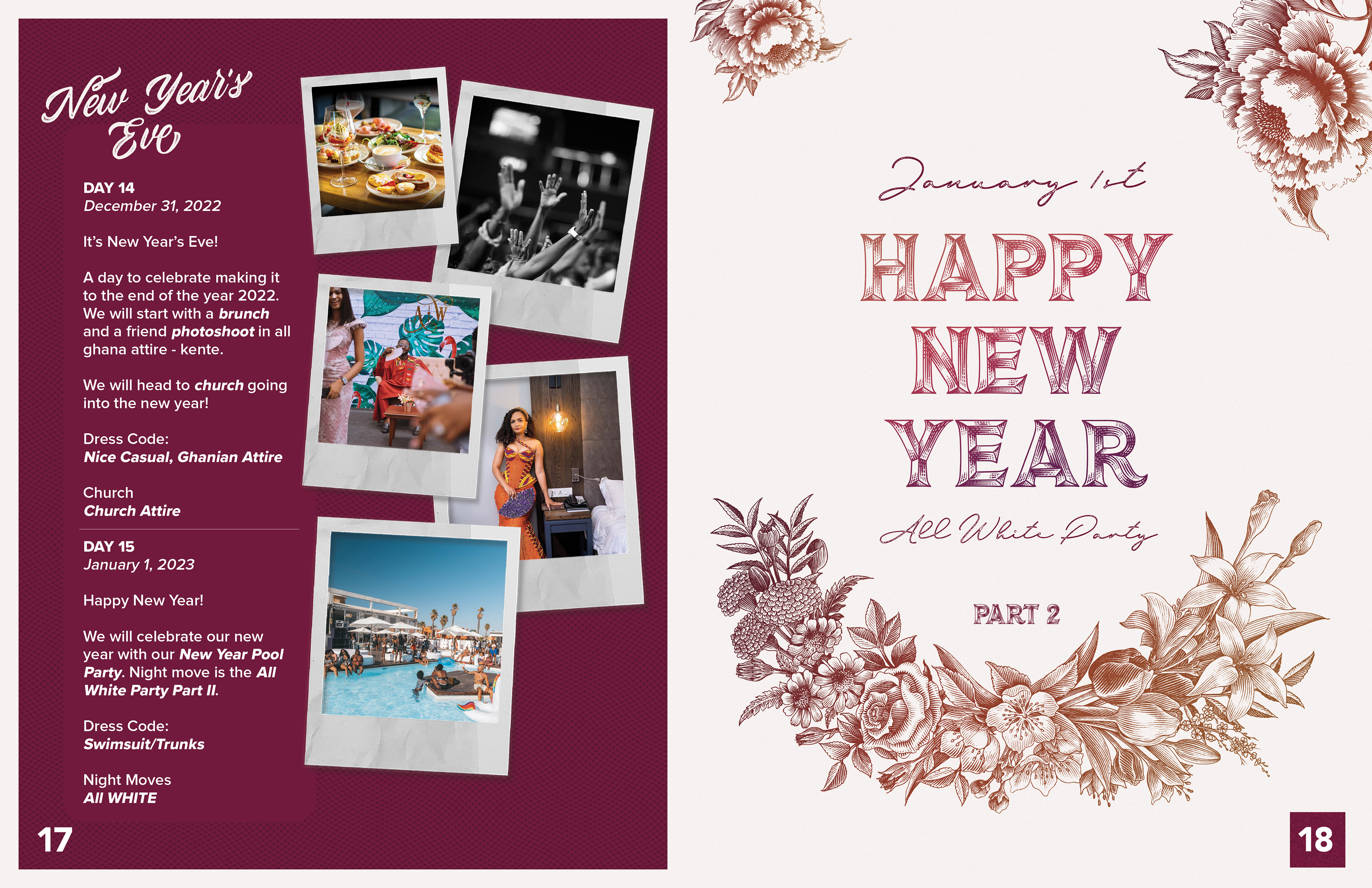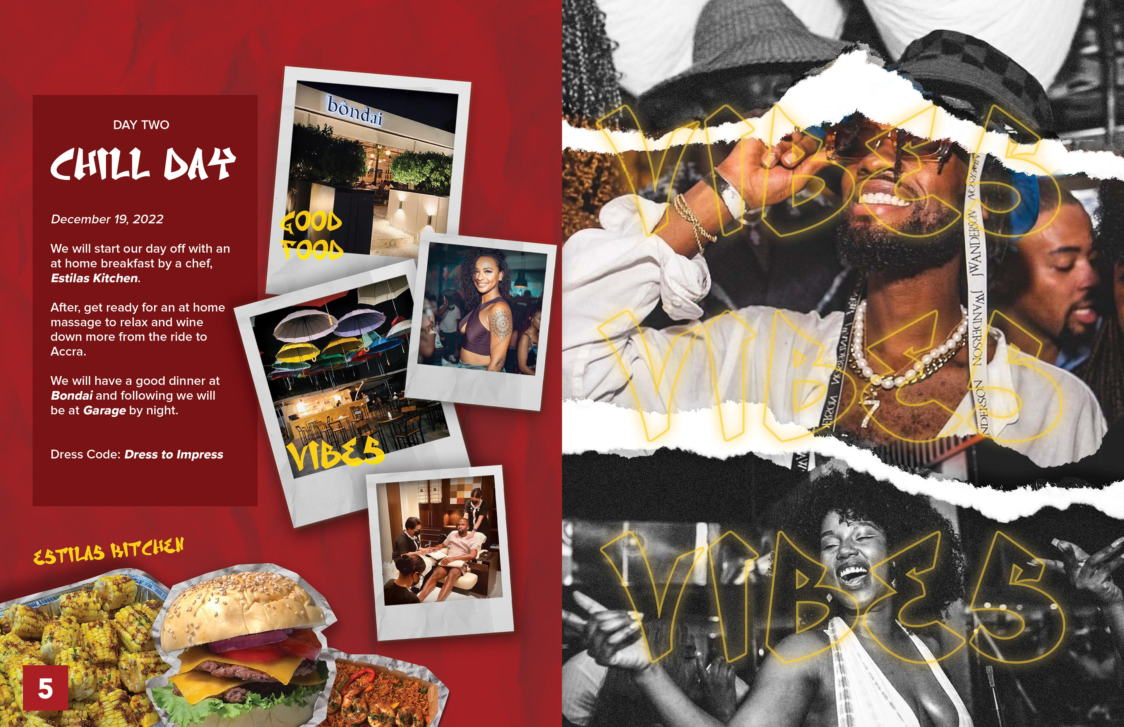 Chale Travel With Me is a new travel agency that travels to Ghana every December. The creative direction was inspired by creating a magazine layout for the itinerary showcasing the different events each day.